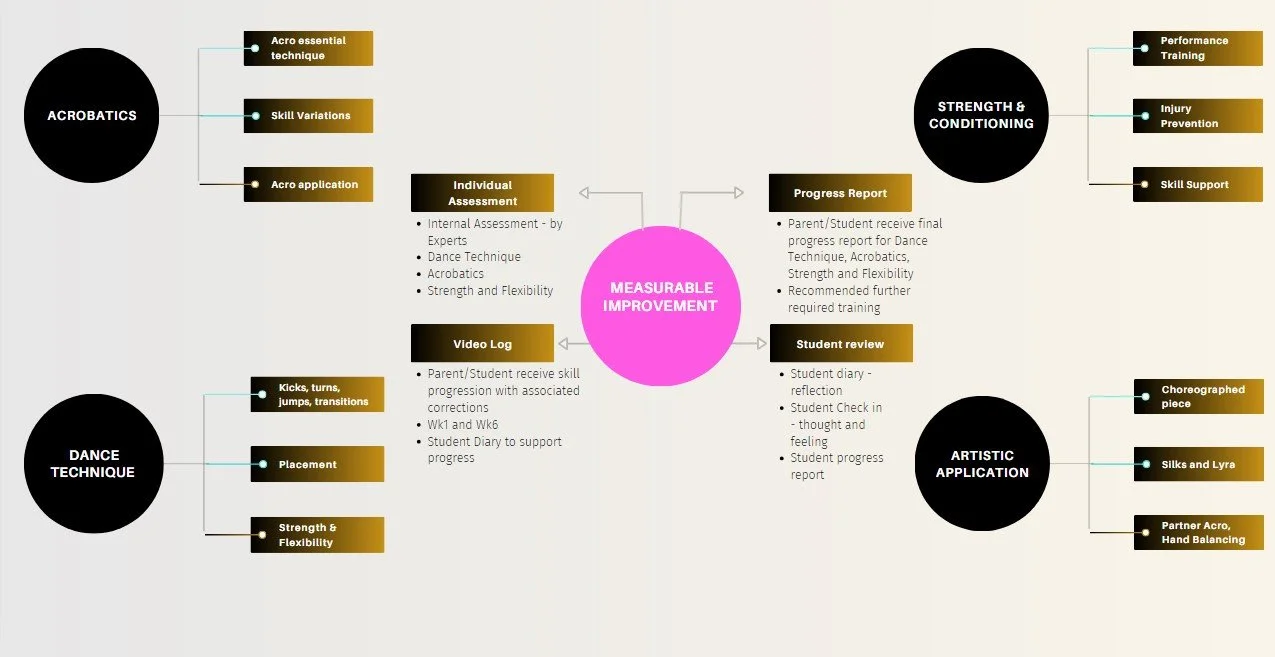 Focusing on enhancing technical proficiency in both acrobatics and dance techniques through structured training and practice.